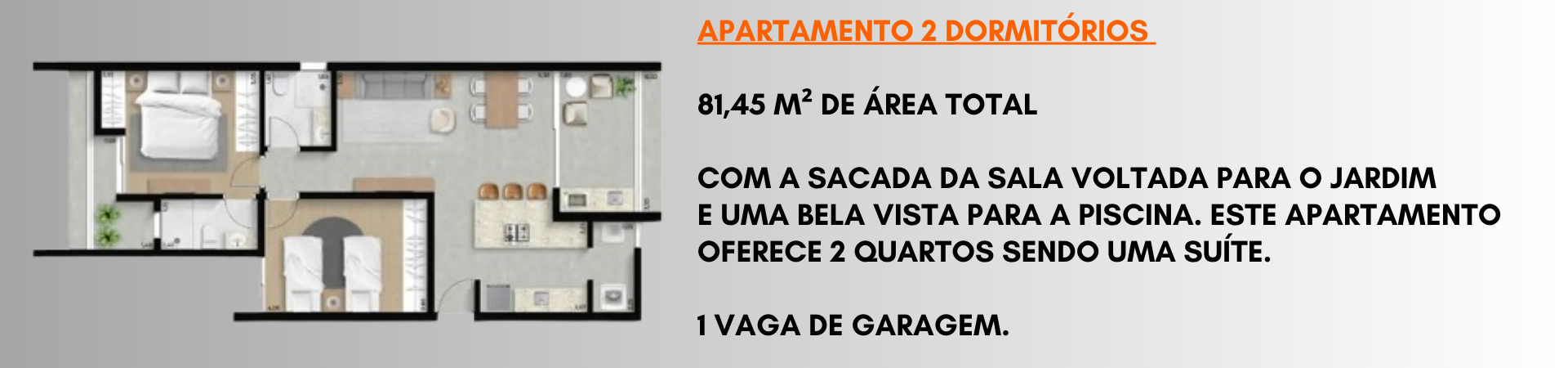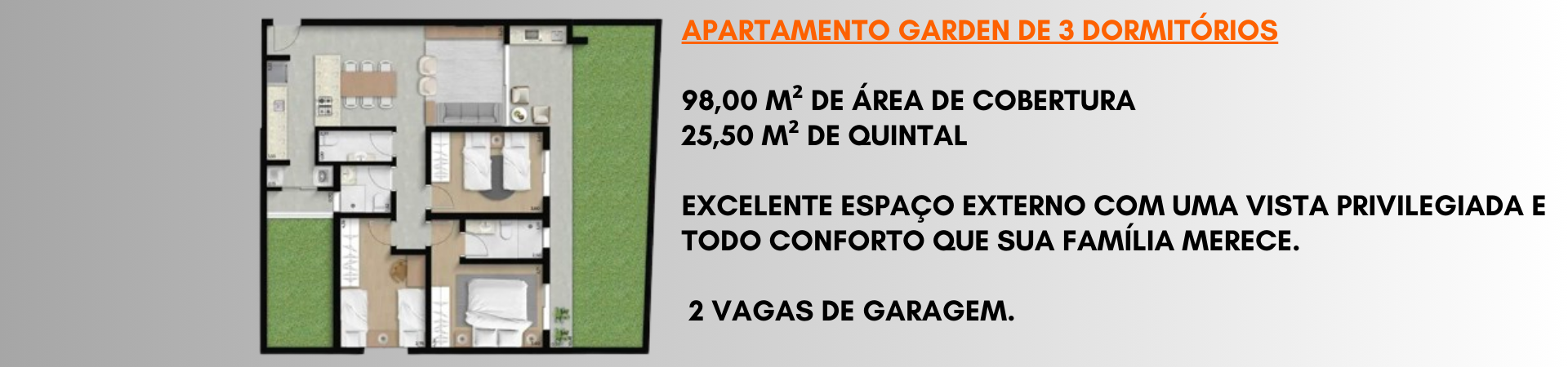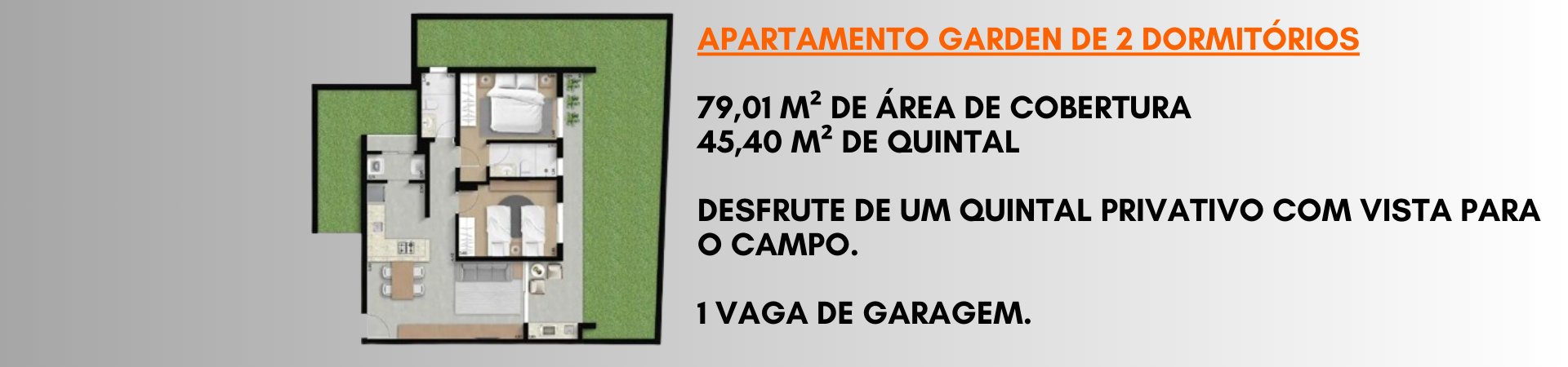 O Empreendimento Village Bromélia conta 8 pavimentos e um total de 32 apartamentos exclusivos, com opções de plantas garden ou de 2 e de 3 dormitórios e sacada gourmet com vista para a serra, cada uma planejada para atender às suas necessidades.